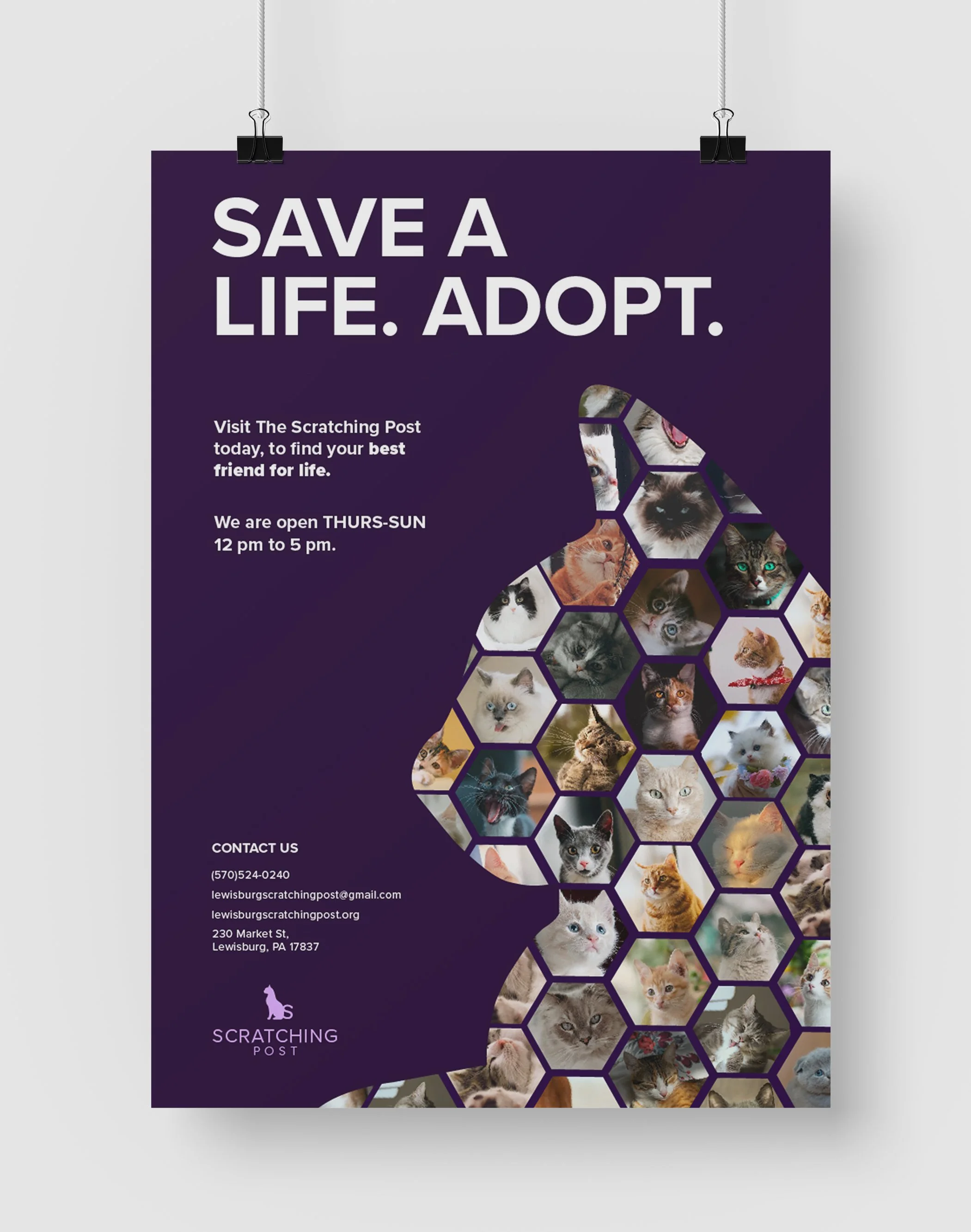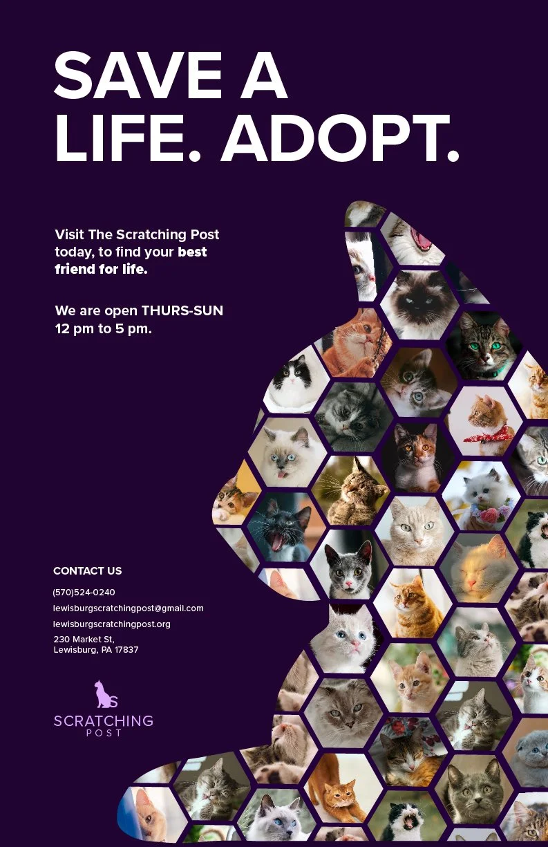This poster was made to make people aware of The Scratching Post, and the words SAVE A LIFE. ADOPT. are to get to the viewer’s heart and grab their attention. Below that, you will find the hours and then the contact information. Through my work you will see those words repeated, to emphasize saving a life can help millions of cats, not just in Lewisburg.