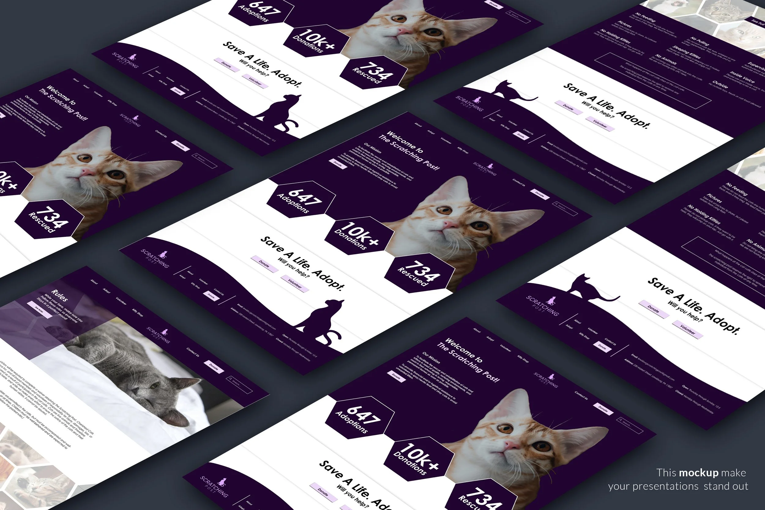 To independently research, design, and produce a logo, website, adoption kit, business card, flyer, and interior graphics for The Scratching Post Cat Cafe.