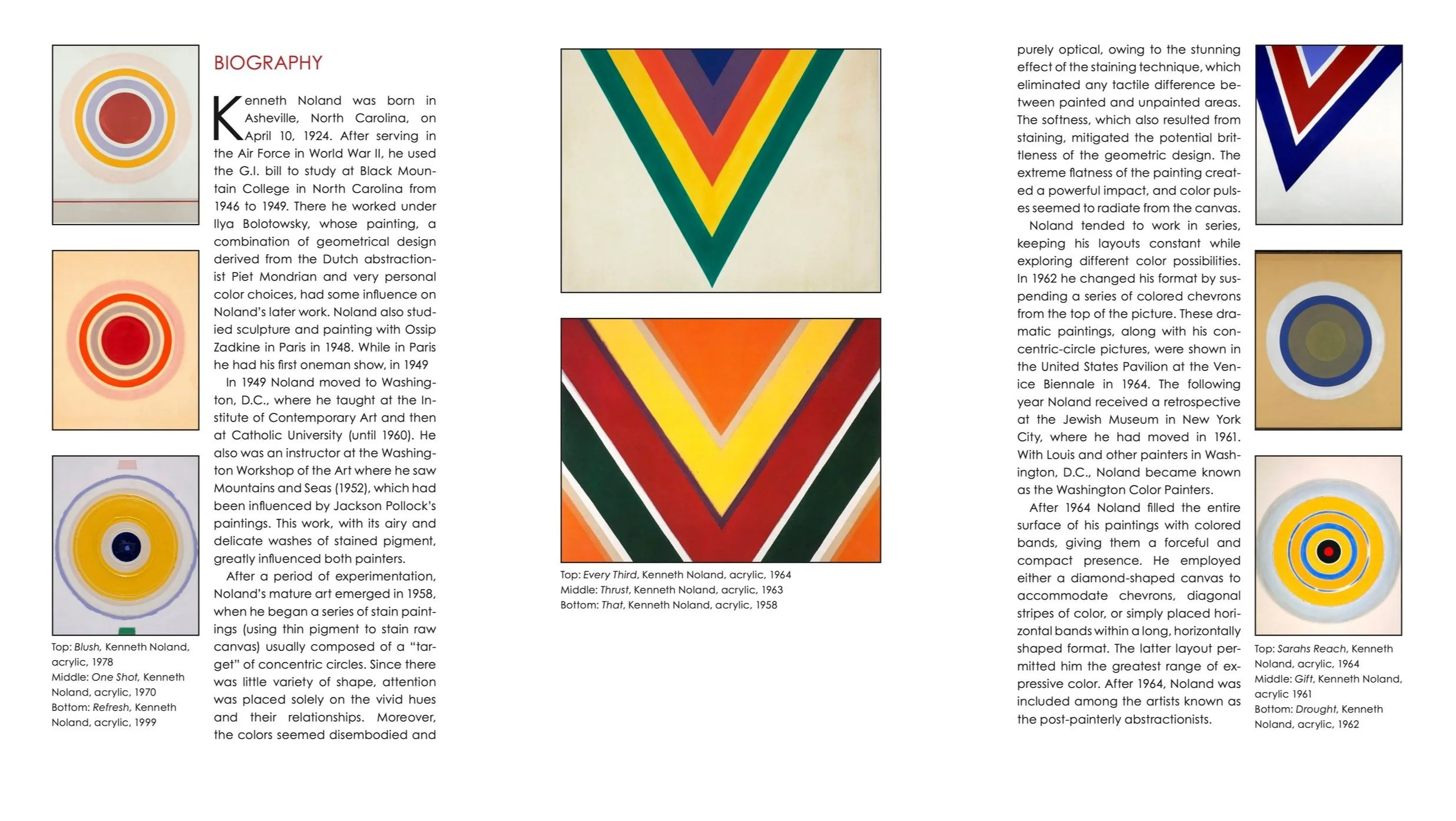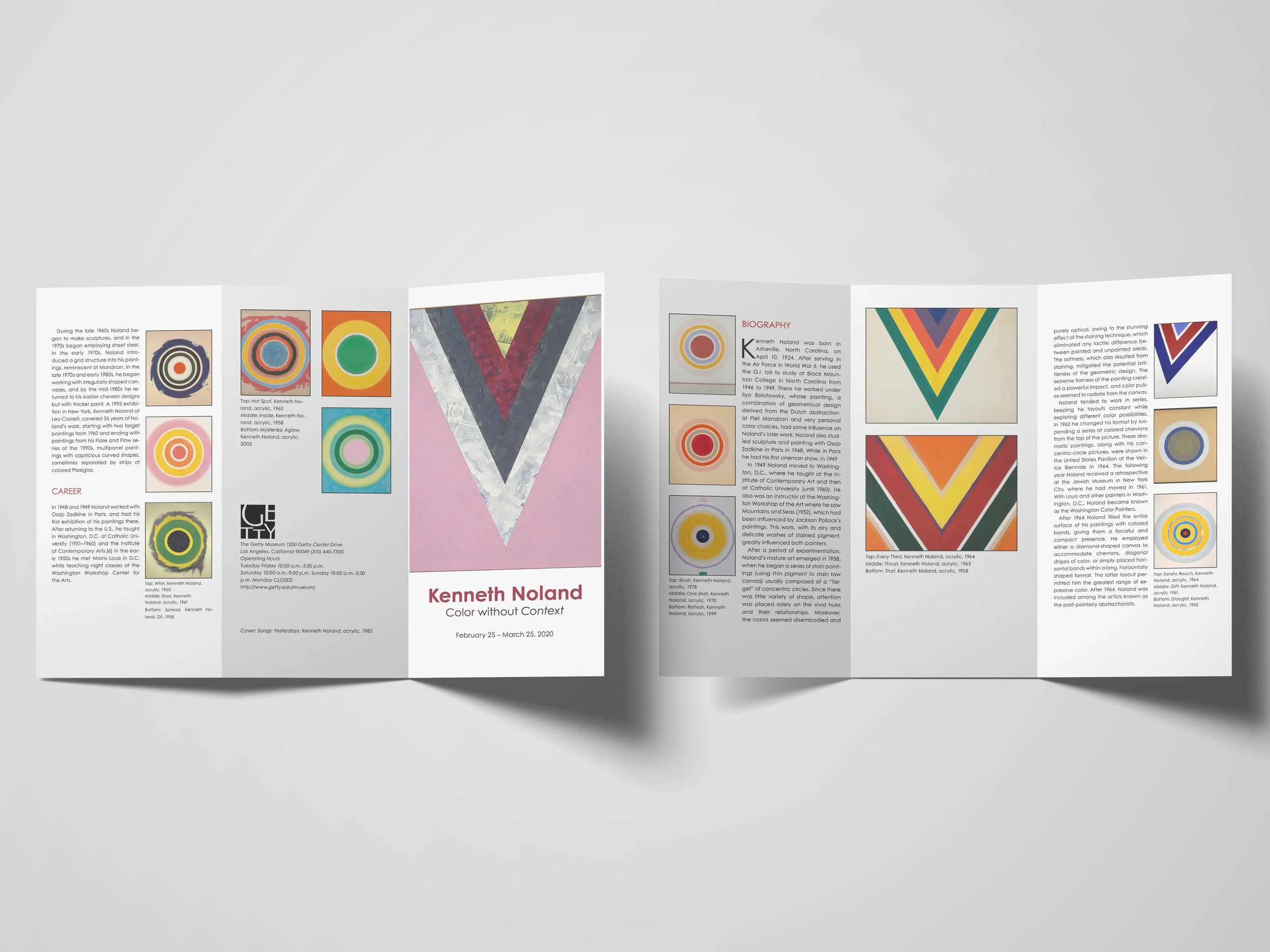 This brochure is to inform the readers about Kenneth Noland and his work at the gallery showing “Color Without Context”.